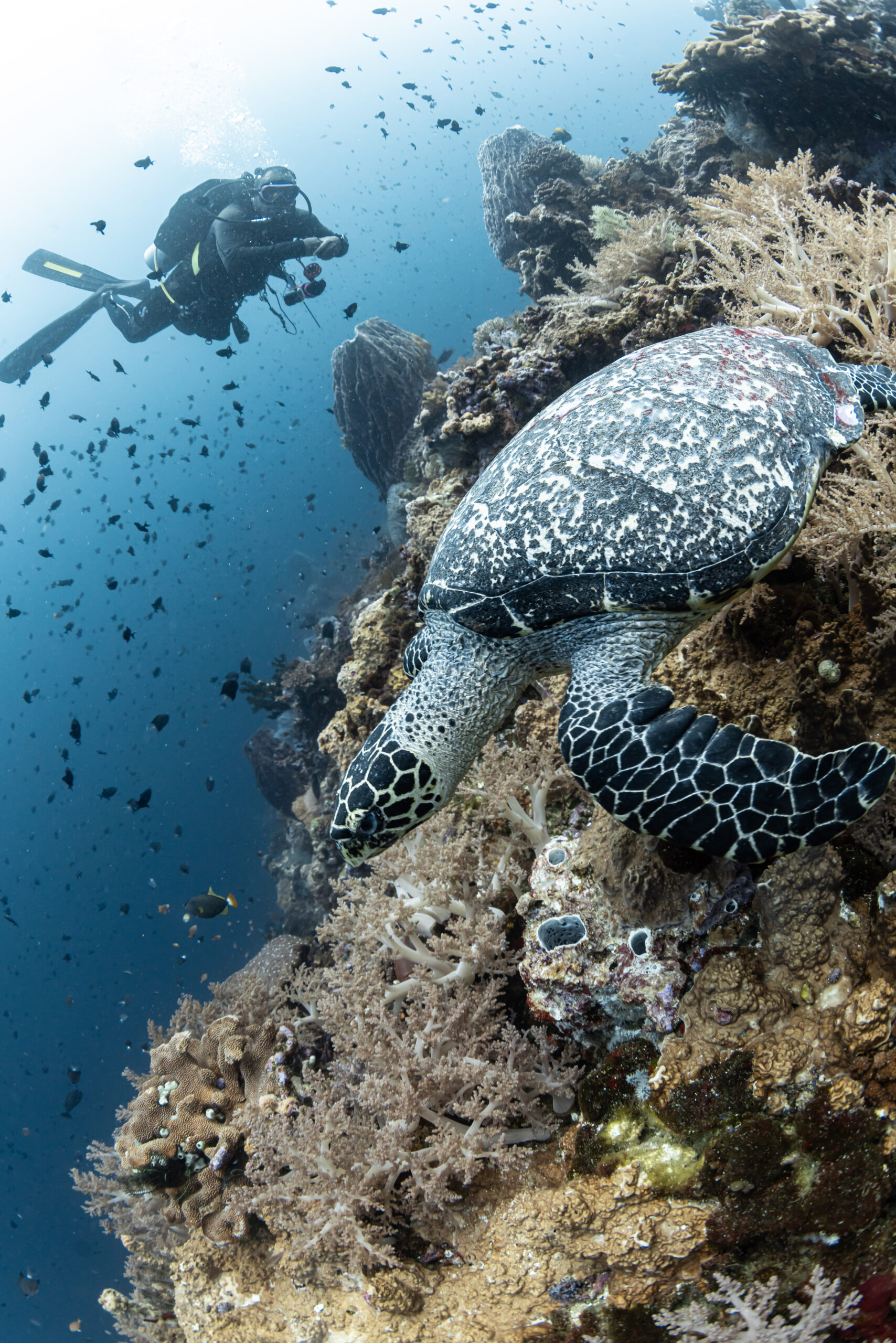 Marine Life: Diver can expect a wide range of topography from shallow reefs, fringing reefs, drop off and wall, pinnacle, cave and swim through with a variety of hard coral, soft coral, sea fans, and sponges. Hammerhead sharks, sea turtles, barracuda, cuttlefish, pipefish, various seahorse species, and massive school of reef fishes are norm.